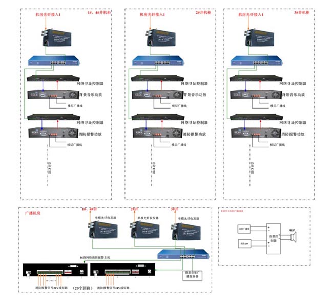 商場公共廣播系統(tǒng)結(jié)構(gòu)由四個部份組成:廣播功放、音源輸入/出、放聲器材、智能播放。四者有機(jī)緊密地結(jié)合為一個統(tǒng)一的公共廣播系統(tǒng),該結(jié)構(gòu)的設(shè)計充分考慮到商場對功能的需求,又注重了系統(tǒng)的建造成本。